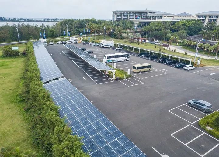 2025年3月16日在海南博鰲零碳示范區(qū)拍攝的建有光伏發(fā)電設(shè)備的停車場(chǎng)(無(wú)人機(jī)照片)。新華社記者 蒲曉旭 攝