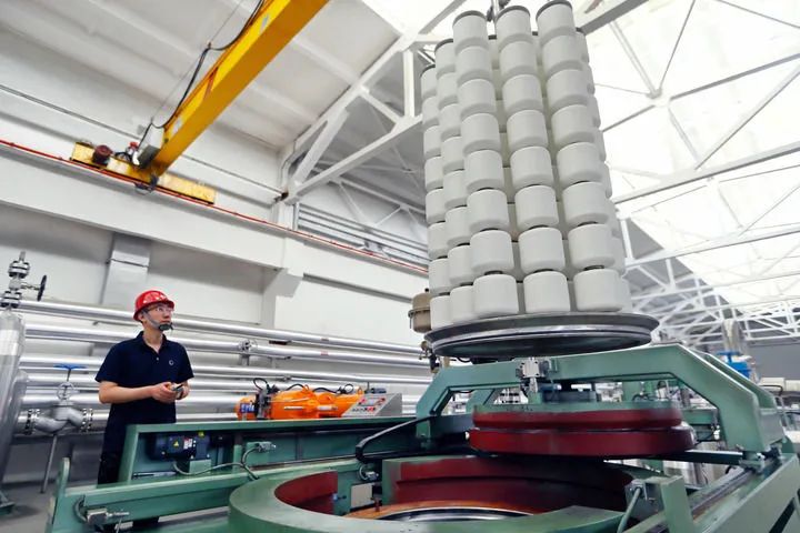 2025年6月20日,在青島市即墨區(qū)即發(fā)集團(tuán)股份有限公司超臨界二氧化碳無(wú)水染色生產(chǎn)線上,工人將一批待染的聚酯纖維筒子紗裝入染缸。新華社發(fā)(梁孝鵬攝)