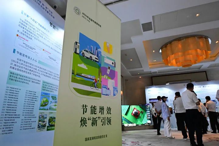 2025年6月23日,2025年全國(guó)節(jié)能宣傳周在山東青島啟動(dòng),人們?cè)诠?jié)能降碳展上參觀。新華社記者 李紫恒 攝