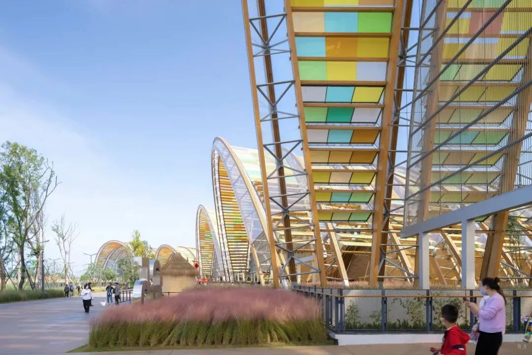 2021年建成的成都天府農(nóng)博園項目,地處美麗的田園景觀中。該項目設(shè)計摒棄傳統(tǒng)工業(yè)展館和商業(yè)會展中心的做法,針對農(nóng)產(chǎn)品銷售展賣,打造類似農(nóng)業(yè)大棚、集市的新型建造體系。
