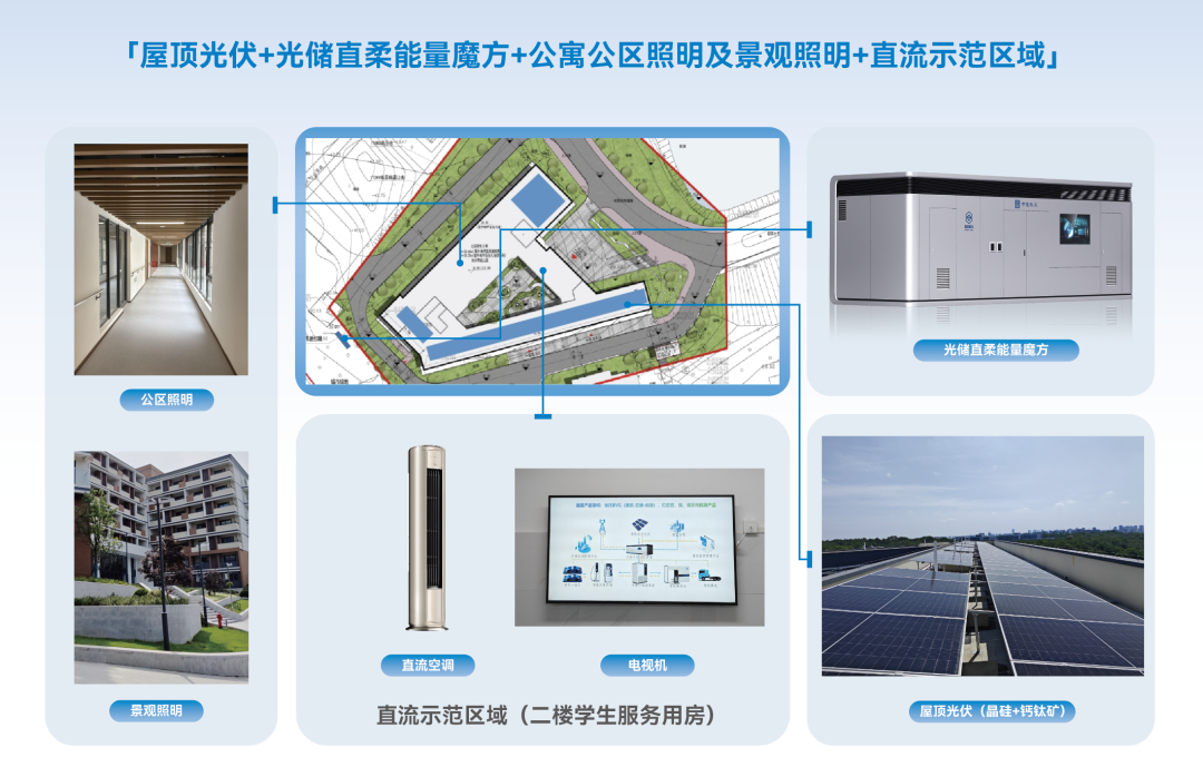 項目位于南京市浦口區(qū),是江蘇省綠建三星暨高品質(zhì)綠色建筑示范項目,已獲得中國建筑節(jié)能協(xié)會首批光儲直柔三星級評價。公寓頂端鋪設(shè)的368平方米太陽能光伏發(fā)電裝置,可將太陽能轉(zhuǎn)化為電能,通過光儲直柔“能量魔方”,為學校提供高效、穩(wěn)定、柔性用電,搭配使用直流空調(diào)等直流設(shè)備。通過“直”的高效供配電與“柔”的智能調(diào)控協(xié)同,實現(xiàn)綠電100%自消納,打造零碳校園標桿。
