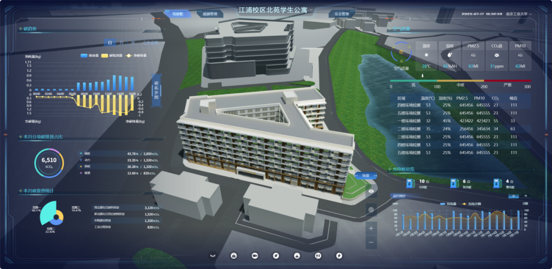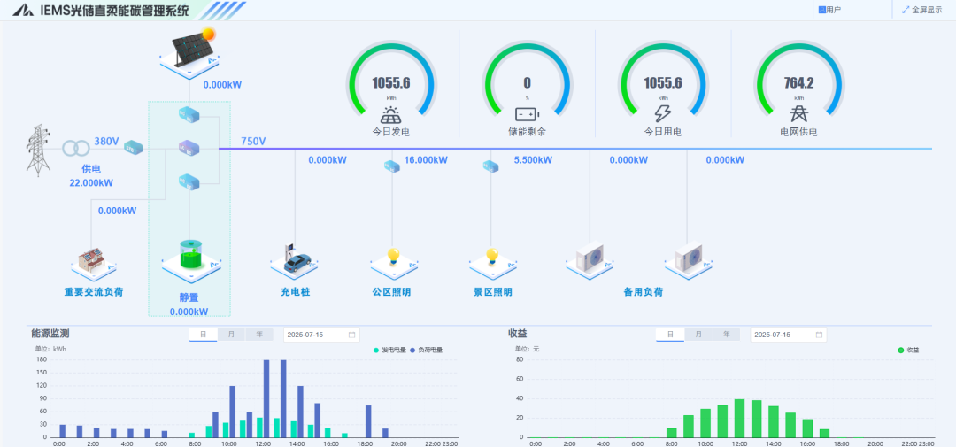 它能實時全景監(jiān)控光伏發(fā)電功率、儲能的充放電狀態(tài)、各區(qū)域動態(tài)用電負荷以及精確計算的碳排放數(shù)據(jù),關(guān)鍵指標在大屏上一目了然;車網(wǎng)互動同樣盡在掌握,充電樁的實時狀態(tài)、充電量乃至電動車向建筑反向送電的能量流都能被清晰展現(xiàn)和靈活調(diào)度。