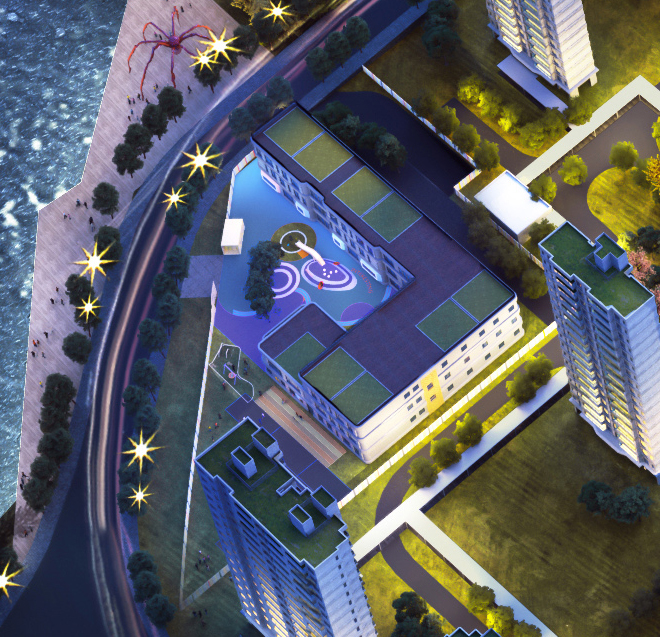 項(xiàng)目D1地塊幼兒園按近零能耗建筑標(biāo)準(zhǔn)設(shè)計(jì),基于當(dāng)?shù)氐臍夂蛱卣骱妥匀粭l件,通過被動(dòng)式技術(shù)手段優(yōu)化,大幅降低建筑供暖、制冷、照明、生活熱水等能耗需求;同時(shí)采用主動(dòng)節(jié)能技術(shù)提高能源設(shè)備系統(tǒng)的效率,加大可再生能源建筑應(yīng)用力度,屋頂設(shè)置太陽能光伏系統(tǒng),生活熱水采用空氣源熱泵系統(tǒng),綜合節(jié)能率可達(dá)到70.98%,可再生能源利用率達(dá)到61.29%。