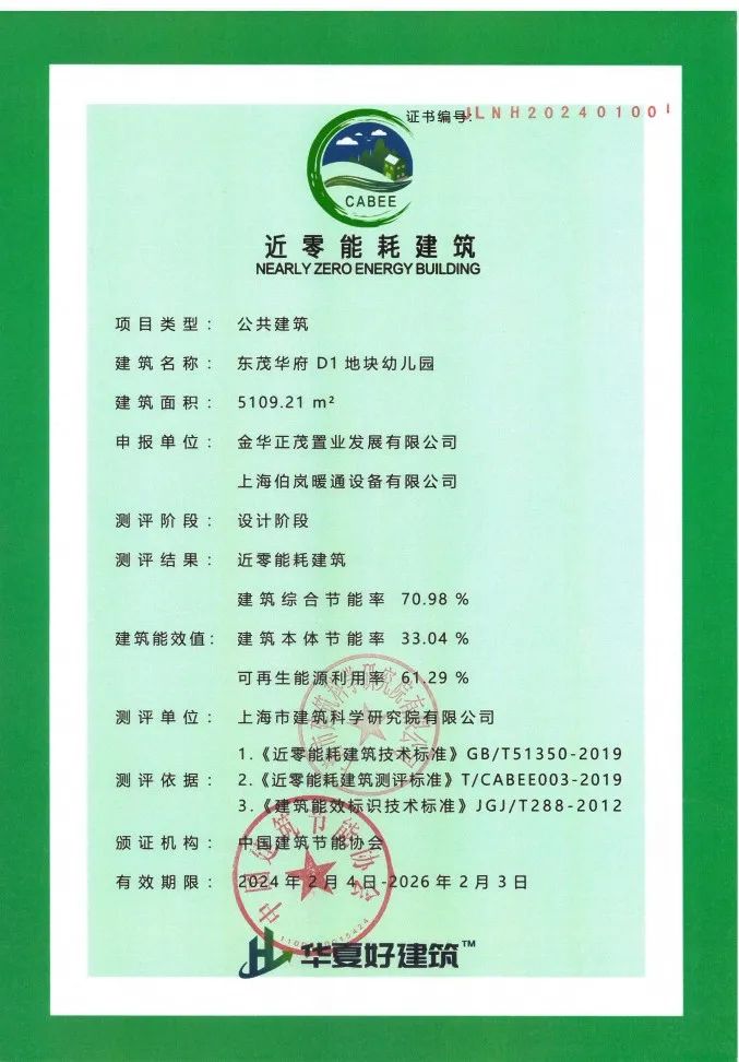 2024年6月該項(xiàng)目獲得超低能耗建筑標(biāo)識(shí),成為東陽市首個(gè)超低能耗建筑。
