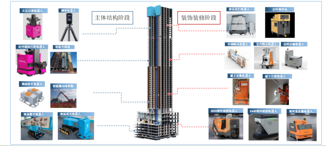 項(xiàng)目全過(guò)程使用建筑機(jī)器人,包括8款大面應(yīng)用機(jī)器人、9款點(diǎn)狀運(yùn)用機(jī)器人,以及N款探索試用機(jī)器人