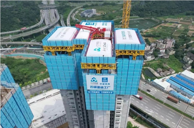 項(xiàng)目1號(hào)樓超高層住宅由中建四局自主研發(fā)的“空中造樓機(jī)”—輕型住宅云端建造工廠建造,集成液壓動(dòng)力、支撐、鋼平臺(tái)、模板、掛架、控制等六大系統(tǒng),融合建筑機(jī)器人、智能感知、自動(dòng)巡檢等技術(shù),設(shè)計(jì)噴霧降溫系統(tǒng)、夜間照明系統(tǒng)、機(jī)器人軌道系統(tǒng)等輔助功能,形成人機(jī)協(xié)同的類(lèi)工廠化作業(yè)環(huán)境。