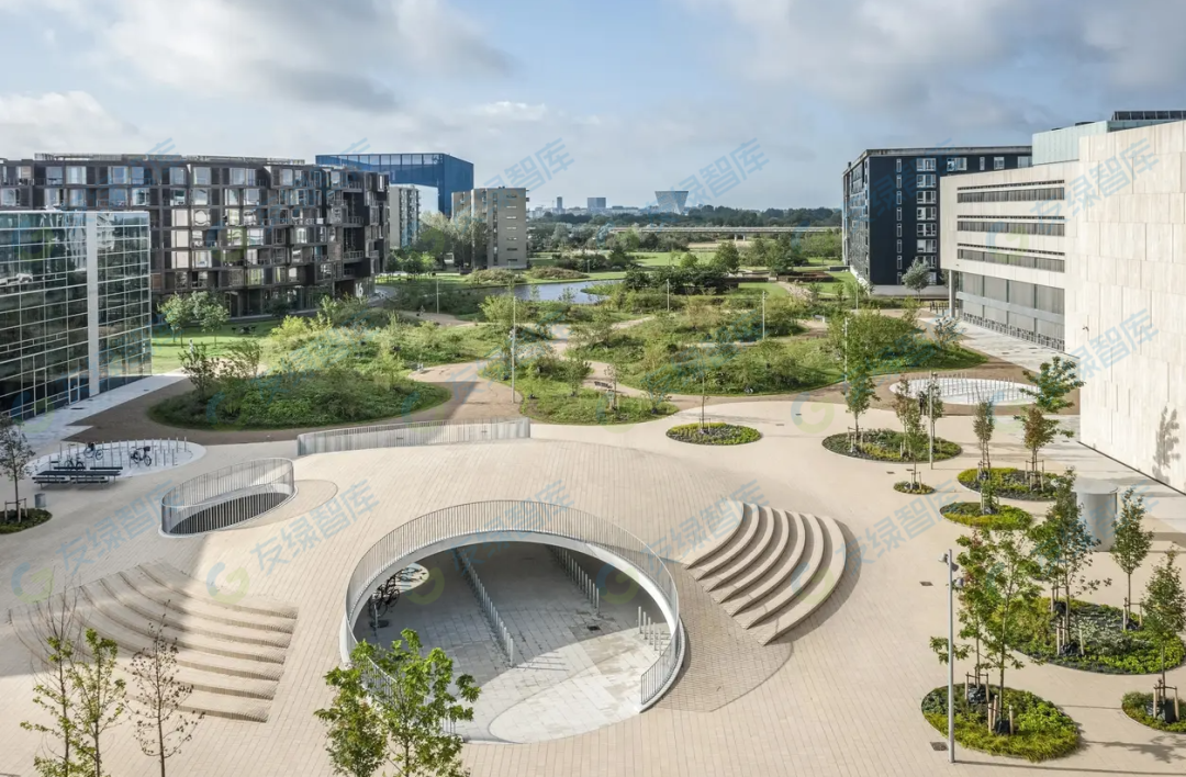 在 Cloudburst 的旗艦項(xiàng)目中,也許沒(méi)有比哥本哈根大學(xué)南校區(qū)的凱倫·布利克森斯廣場(chǎng)更令人瞠目結(jié)舌的了,它是該市最大的公共空間之一。占地近五英畝的起伏的澆筑混凝土圓頂和橢圓形袖珍花園是學(xué)生和公眾的聚集空間、活動(dòng)場(chǎng)所和雨水集水區(qū)。在極端降水的情況下,可以容納 2,000 多輛自行車的自行車庫(kù)能夠保留雨水,從而減輕附近運(yùn)河的壓力。在整個(gè)廣場(chǎng)上,種植的花園床還可以吸收水分,促進(jìn)蒸散,并為昆蟲、鳥類和野花提供棲息地。