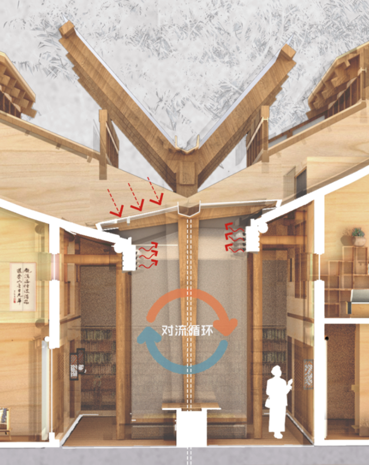 空調(diào)外機只是綠色建筑宏大敘事里的一個逗號,建筑熱管理散落于建筑的每一寸肌理:光伏、屋頂、幕墻、設(shè)備……任何單一技術(shù)都容易陷入“按下葫蘆浮起瓢”的窘境,只有讓多技術(shù)策略精準(zhǔn)協(xié)同,才能觸發(fā)“1+1>2”的綠色增益效應(yīng)。在第二屆綠色建筑建筑設(shè)計競賽一等獎的作品《Y-HOUSE——讓庭院隨自然呼吸的木構(gòu)探索》中,把人頭頂高度的外機排熱當(dāng)作設(shè)計起點:低碳木構(gòu)為骨架,可變遮陽為皮膚,空調(diào)遮擋構(gòu)件為“導(dǎo)流片”,再把庭院通風(fēng)系統(tǒng)嵌入其中,熱脅迫感被削去,通過在有機更新中顯著提升了空間舒適性與生態(tài)效益。