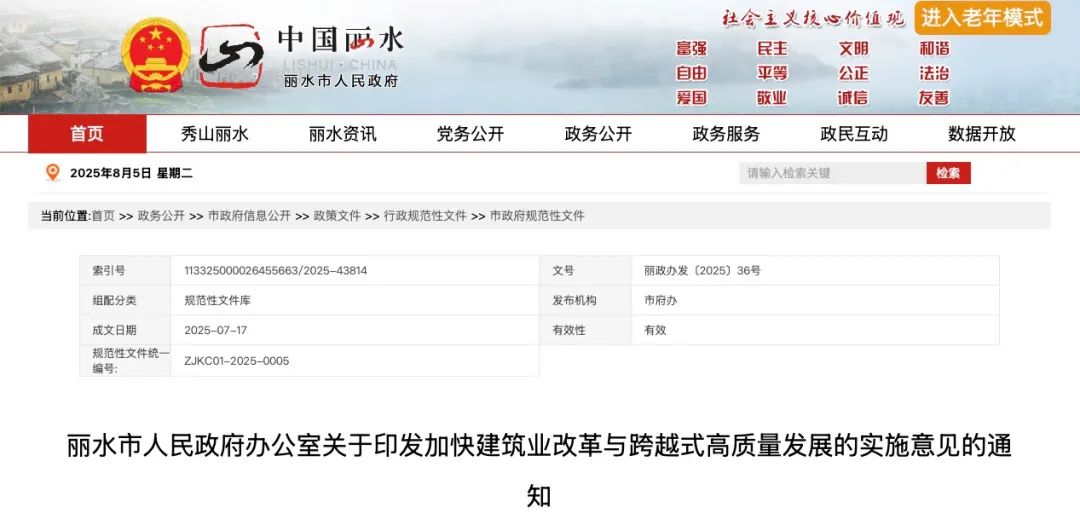2025年7月17日,麗水市人民政府辦公室印發(fā)《加快建筑業(yè)改革與跨越式高質(zhì)量發(fā)展的實施意見》。