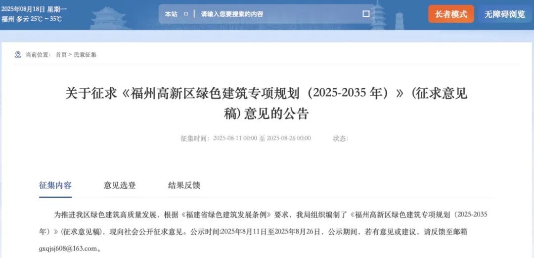 2025年8月11日,福州高新區(qū)城鄉(xiāng)建設(shè)局發(fā)布《福州高新區(qū)綠色建筑專項規(guī)劃(2025-2035 年)》 (征求意見稿) ,向社會公開征求意見。