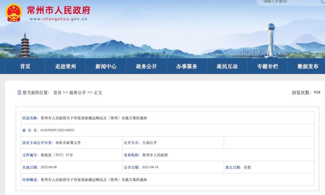 2025年8月8日,常州市人民政府印發(fā)《國家碳達峰試點(常州)實施方案》。
