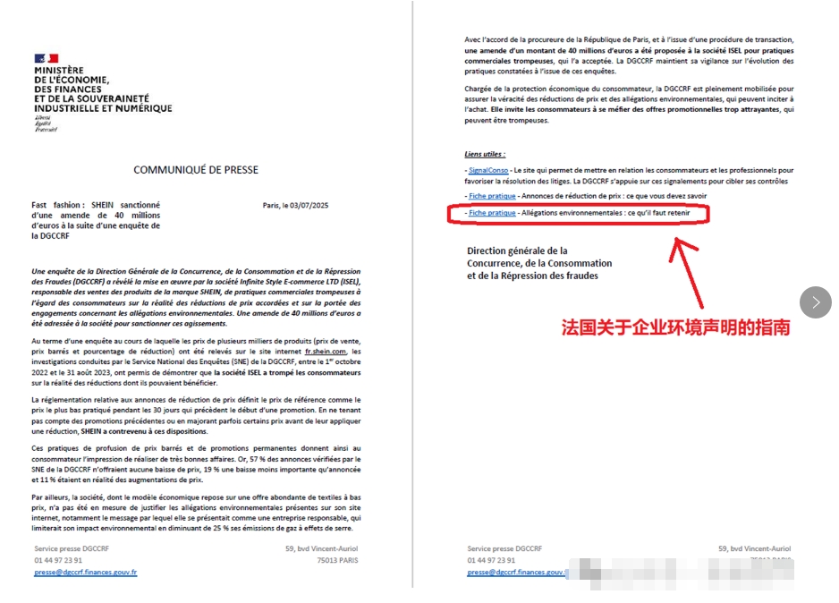 20258月,意大利競爭管理局(AGCM)對在歐洲運(yùn)營Shein在線交易平臺的Infinite Styles Services公司處以100萬歐元的罰款,原因是其綠色聲明具有誤導(dǎo)和遺漏,同時(shí)發(fā)布了詳細(xì)的處罰報(bào)告。法國7月也對Shein開具4000萬歐元罰單,理由同樣包括“虛假環(huán)境聲明”。