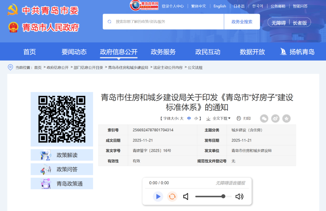2025年12月5日,青島市正式發(fā)布全國首個《“好房子”建設(shè)標(biāo)準(zhǔn)體系》,整合1200余項標(biāo)準(zhǔn)構(gòu)建全鏈條全周期規(guī)范體系,這一舉措既是對國家“好房子”建設(shè)號召的精準(zhǔn)響應(yīng),也為我國居住品質(zhì)升級提供了可復(fù)制、可推廣的實踐樣本。從國家將“好房子”建設(shè)寫入政府工作報告,到地方層面出臺系統(tǒng)性標(biāo)準(zhǔn)與配套政策,我國“好房子”政策正呈現(xiàn)出清晰的演進脈絡(luò),而青島標(biāo)準(zhǔn)體系的發(fā)布,更在政策落地、行業(yè)規(guī)范、民生保障等多個維度具有里程碑式的意義。