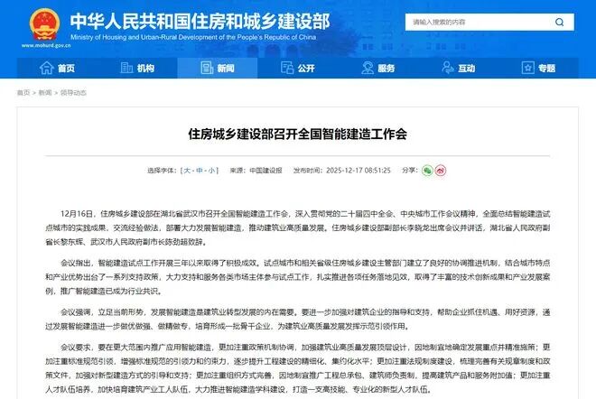 2025年12月,住建部聯(lián)合國家發(fā)改委、工信部等13個部門印發(fā)《關(guān)于全面推進智能建造發(fā)展的指導(dǎo)意見》,明確2026年為智能建造全面推廣元年。