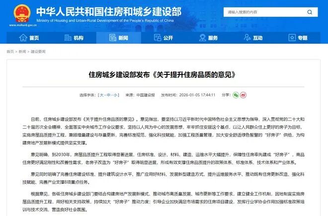 住建部在2025年12月首次系統(tǒng)提出“好房子”建設(shè)標準,并明確2026年起在全國推行。