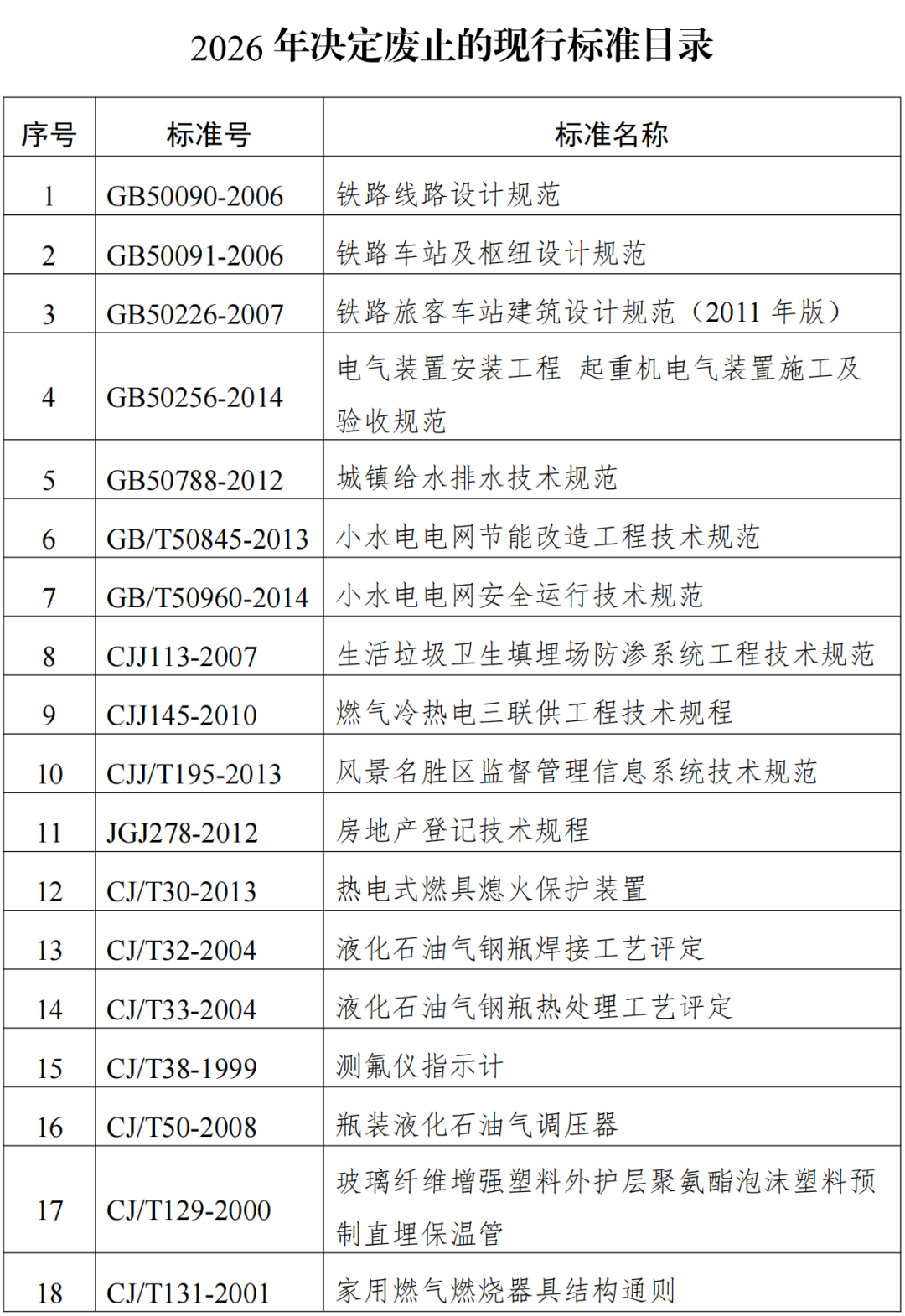 時間:2026-02-01 15:04:45 作者:GBWindows 來源:行業(yè)網(wǎng)站 閱讀:634內(nèi)容摘要:住房城鄉(xiāng)建設(shè)部1月30日發(fā)布公告,決定廢止《鐵路線路設(shè)計規(guī)范》等72項現(xiàn)行工程建設(shè)標準。全文如下:住房城鄉(xiāng)建設(shè)部關(guān)于廢止《鐵路線路設(shè)計規(guī)范》等72項標準的公告為持續(xù)優(yōu)化和完善工程建設(shè)標準體系,按照《中華人民共和國標準化法》、《工程建設(shè)國家標準管理辦法》、《工程建設(shè)行業(yè)標準管理辦法》有關(guān)規(guī)定,住房城鄉(xiāng)建設(shè)部對現(xiàn)行工程建設(shè)...