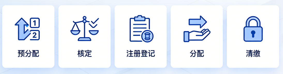 《通知》對碳排放配額管理進行了全流程拆解,將原有“分配-履約”的兩環(huán)節(jié)流程,細化為“預分配-核定-注冊登記-分配-清繳”的五環(huán)節(jié)全鏈條,實現(xiàn)了配額權屬的清晰化和操作的規(guī)范化: