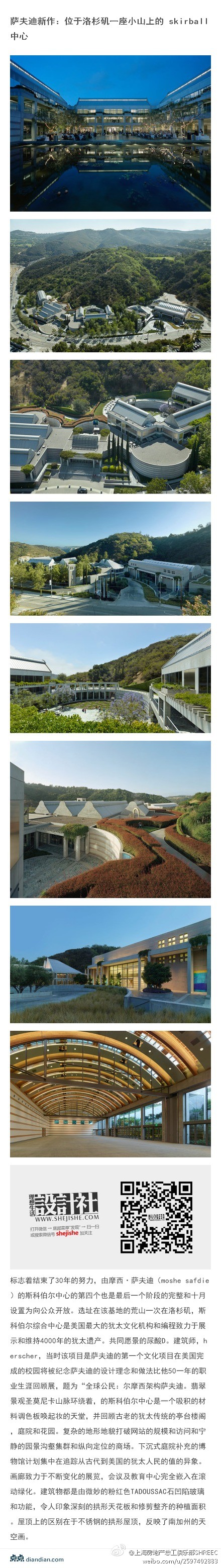 @上海房地產(chǎn)總工俱樂部SHREEC: 薩夫迪新作:位于洛杉磯一座小山上的 skirball 中心:下沉式庭院補(bǔ)У牟┪錒菁蘋集中在追蹤從古代到美國的猶太人民的值的異象。畫廊致力于不斷變化的展覽,會議及教育中心完全嵌入在滾動綠化。令人印象深刻的拱形天花板和修剪整齊的種植面積。不銹鋼的拱形屋頂,反映了南加州的天空畫。