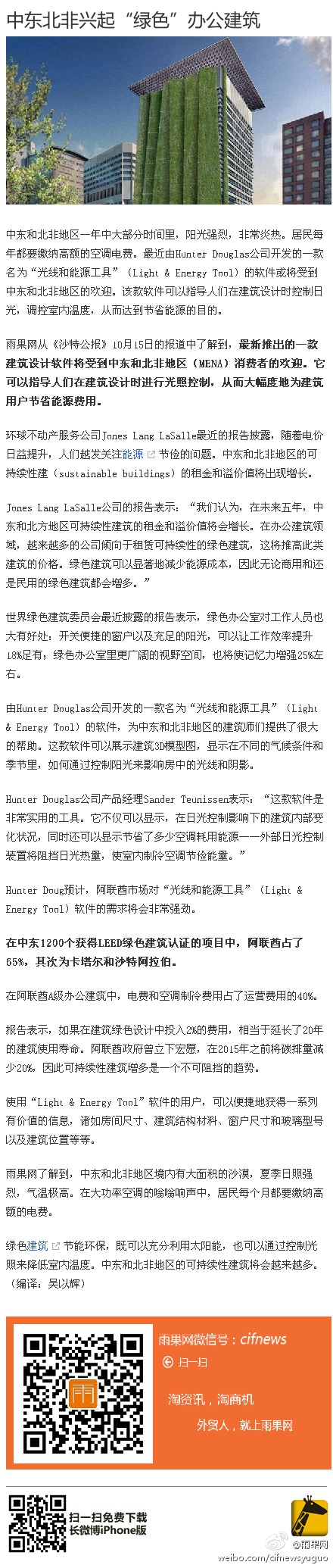 @雨果網(wǎng):中東北非興起“綠色”辦公建筑 中東和北非地區(qū)境內(nèi)有大面積的沙漠,夏季日照強烈,氣溫極高。在大功率空調(diào)的嗡嗡響聲中,居民每個月都要繳納高額的電費。綠色建筑節(jié)能環(huán)保,既可以充分利用太陽能,也可以通過控制光照來降低室內(nèi)溫度。