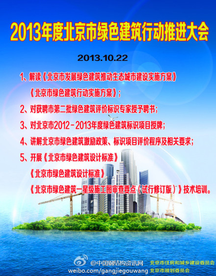 @中國鋼結(jié)構(gòu)資訊網(wǎng):北京綠色建筑行動大會將開 由北京住建委和北京規(guī)劃委聯(lián)合舉辦的2013年度北京<綠色建筑行動推進大會將于10月22日在北京建設(shè)大廈舉行,費用免費。會議內(nèi)容見下圖