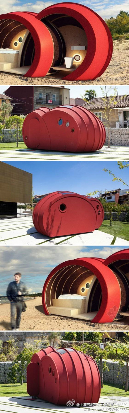 @上海房地產(chǎn)總工俱樂部SHREEC: 綠色建筑 shelter byGG概念住宅:這座小型建筑建在葡萄牙。這個實驗性的居住概念方案將雕塑與建筑相結合,創(chuàng)造出了一個類似于蠶繭的居住小空間。這個可移動的居住模塊配有一個雙人間和一個浴室。建筑師將可持續(xù)性作為設計的重點,在建造過程中使 生態(tài)材料,并用太陽能光電板作為能源收集方式。