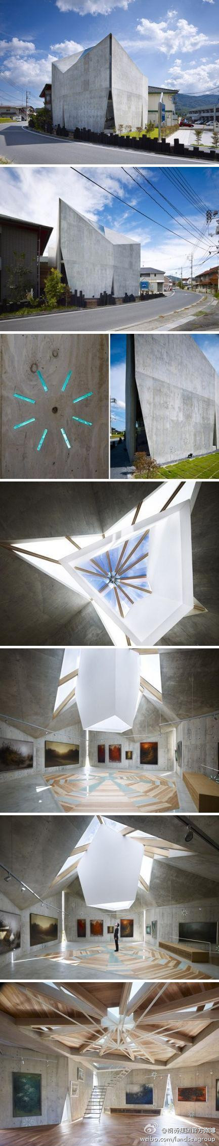 @朗詩集團官方微博: 綠色建筑 折紙,在日本是一項古老的手工藝。受廣島一位喜歡日本風格繪畫的業(yè)主委托,NAF Architect & Design 事務設計了一座折紙般的私人博物館。當柔軟的紙張變成堅硬的清水混泥土建筑,沒有立柱,沒有橫梁,博物館的結構主要是墻體。需要經過嚴謹的力學計算分析,才能確保其穩(wěn)固結實。