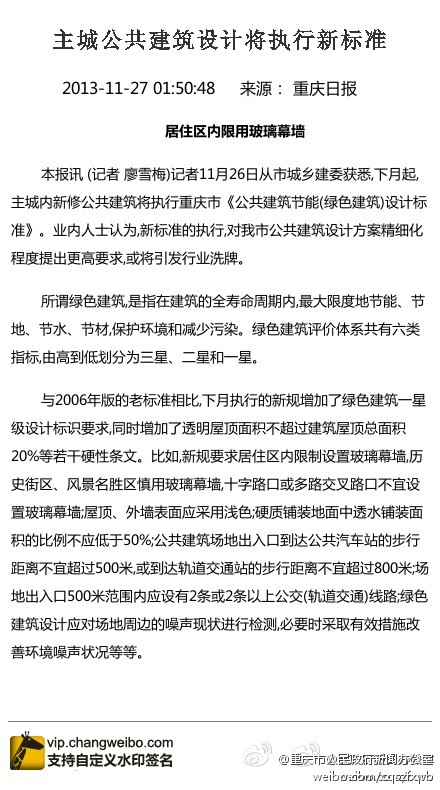 @重慶市人民政府新聞辦公室: 主城公共建筑設(shè)計將執(zhí)行新標準 居住區(qū)內(nèi)限用玻璃幕墻 記者11月26日從市城鄉(xiāng)建委獲悉,下月起,主城內(nèi)新修公共建將執(zhí)行重慶市《公共建筑節(jié)能(綠色建筑)設(shè)計標準》。業(yè)內(nèi)人士認為,新標準的執(zhí)行,對我市公共建筑設(shè)計方案精細化程度提出更高要求,或?qū)⒁l(fā)行業(yè)洗牌。