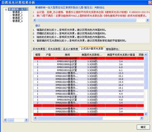 軟件根據(jù)采光分析結(jié)果,評(píng)價(jià)本項(xiàng)目采光質(zhì)量。對(duì)于采光不達(dá)標(biāo)的房間,軟件給出相應(yīng)的優(yōu)化建議,幫助設(shè)計(jì)師快捷的找到優(yōu)化途徑,合理改善該房間的采光質(zhì)量。