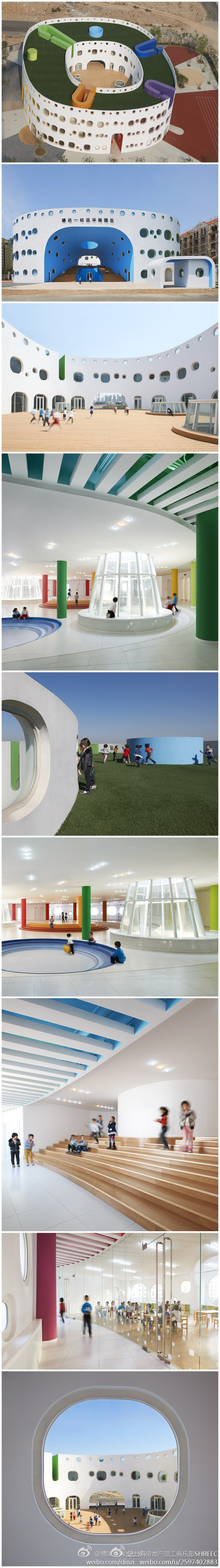 @d海房地產(chǎn)總工俱樂部SHREEC:綠色建筑 這座圓形城堡似的幼兒園-LOOP,由Keiichiro Sako創(chuàng)建的位于北京的Sako Architects工作室負(fù)責(zé)設(shè)計。LOOP國際幼兒園位于天津,有45000平方尺。建筑以白色墻壁為主,墻面上開設(shè)了大小不同的類似飛機(jī)窗口一樣的窗戶,不同功能的窗戶d刷上了不同的顏色,讓人能容易地分辨出房間的使用功能。
