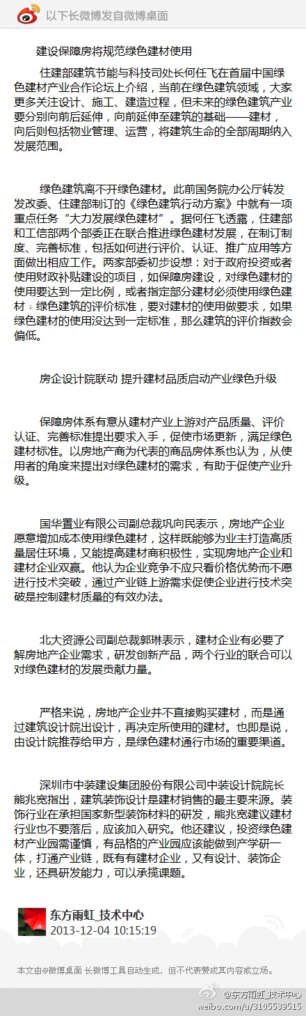 @東方雨虹_技術(shù)中心:建設(shè)保障房將規(guī)范綠色建材使用 住建部建筑節(jié)能與科技司處長何任飛在首屆中國綠色建材產(chǎn)業(yè)合作論壇上介紹,當(dāng)前在綠色建筑領(lǐng)域,大家更多關(guān)注設(shè)計、施工、建造過程2但未來的綠色建筑 ..
