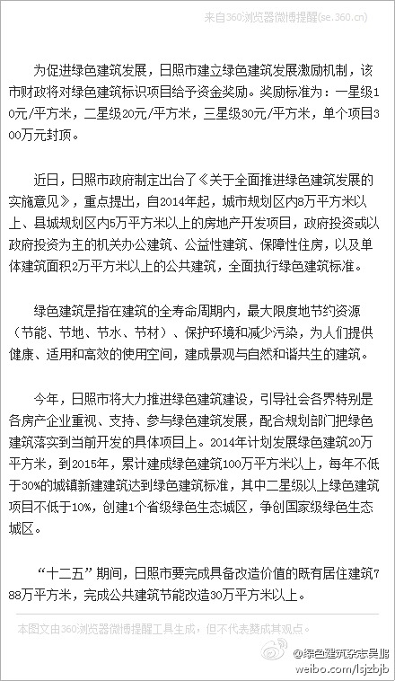 @綠色建筑雜志吳鵬:為促進(jìn)綠色建筑發(fā)展,日照市建立綠色建筑.展激勵機(jī)制,該市財(cái)政將對綠色建筑標(biāo)識項(xiàng)目給予資金獎勵。獎勵標(biāo)準(zhǔn)為:一星級10元/平方米,二星級20元/平方米,三星級30元/平方米,單個項(xiàng)目300萬元封頂。 近日 ……