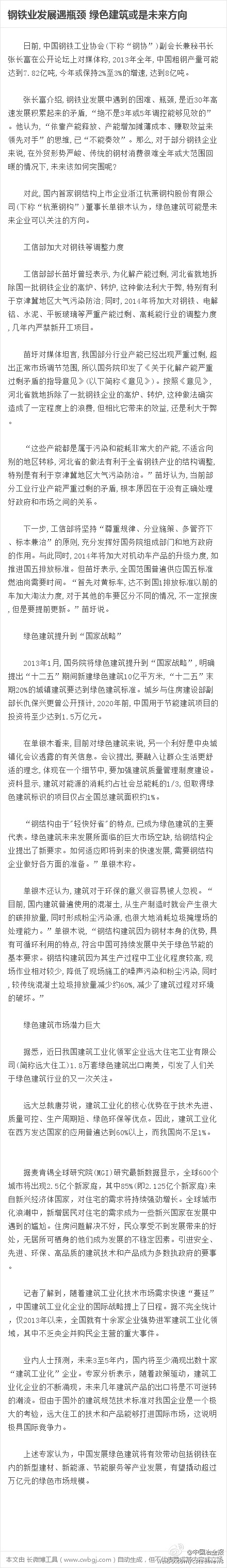 時間:2014-01-26 13:48:12 作者:綠建之窗 來源:綠建之窗 閱讀:1363內(nèi)容摘要:1.鋼鐵業(yè)發(fā)展遇瓶頸綠色建筑或是未來方向@中國冶金報:鋼鐵業(yè)發(fā)展遇瓶頸綠色建筑或是未來方向日前,中國鋼鐵工業(yè)協(xié)會(下稱“鋼協(xié)”)副會長兼秘書長張長富在公開論壇上對媒體稱,2013年全年,中國粗鋼產(chǎn)量可能達到7.82億噸,(詳見長微博)...2.健康是一項基本人權(quán),綠色建筑對此大...1.鋼鐵業(yè)發(fā)展遇瓶頸 綠色建筑或是未來方向