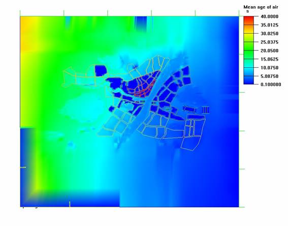 圖3 溫 度 圖Fig.3 temperature picture通過在CFD中的模擬計(jì)算,得出城市在受到一定氣候影響中的溫度、風(fēng)速、大氣壓和太陽輻射情況,通過綜合分析這些模擬計(jì)算結(jié)果,最終得出有科學(xué)依據(jù)的城市規(guī)劃布局與城市氣候之間的關(guān)系。以武漢市夏季白天為例,模擬城市在西南主導(dǎo)風(fēng)向作用下的溫度情況。通過模擬計(jì)算出的溫度圖(圖3),可以明顯看出,在夏季白天主導(dǎo)風(fēng)向情況下,武漢市熱區(qū)域分布構(gòu)成以市區(qū)為主,面積大、分布集中的多中心城市熱區(qū)域的主要特征。市區(qū)被長江、漢江分割形成三鎮(zhèn)(漢口、漢陽、武昌)四片(漢口、漢陽、武昌、青山)的多中心結(jié)構(gòu)。針對漢口主城區(qū)而言,大面積城區(qū)溫度高,武昌和漢陽城區(qū)部分地區(qū)溫度高,其它地區(qū)溫度相對較低,明顯形成了城市的“熱島效應(yīng)”。從速度圖和空氣齡圖(圖