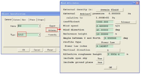 3 自然風(fēng)邊界條件設(shè)置:(wind是PHOENICS新增的功能,根據(jù)當(dāng)?shù)氐臍庀髷?shù)據(jù)進(jìn)行設(shè)置,方便快捷)氣象數(shù)據(jù):10m高時(shí)速度為2.6m/s 東北風(fēng)等參數(shù)設(shè)置。