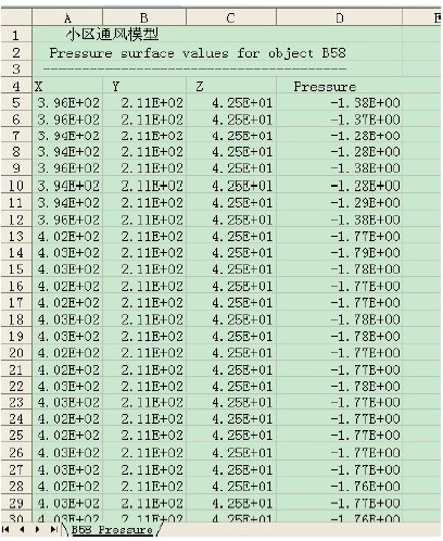 那么在PHOENICS的工作文件夾d_privl下面會(huì)產(chǎn)生一個(gè)B58_Pressure.csv文件,打開(kāi)查看即為該建筑物表面各點(diǎn)的Pressure值