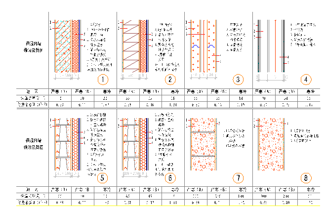 三、保溫材料的類型及選用原則從保溫材料而言,目前在建筑上較為普遍采用的是在墻體上粘貼各種發(fā)泡板材,如普通泡沫聚苯板(又稱模塑板)、擠塑聚苯板和硬質(zhì)發(fā)泡聚氨酯板;第二類即棉類保溫材料,如巖棉或玻璃棉(其中也分卷材和板材)以上兩類材料均為工廠工業(yè)化制品,用粘結(jié)或錨固方法與墻體固定;第三類即現(xiàn)場噴涂型的保溫材料,如硬質(zhì)發(fā)泡聚氨酯和安健能公司介紹的全水基軟泡氨酯。在幕墻工程中上述各類保溫材料幾乎都能使用。保溫材料的選擇取決于下列諸因素:第一 裝飾面層類型,如前所述,因?yàn)橐紤]到抹灰層與保溫層以及裝飾層之間的結(jié)合和避免開裂等問題,所以如選用抹灰型裝飾面層則較為局限,幕墻型干掛板材裝飾面層,則較為自由,這是因?yàn)楸貙?、裝飾層均是相對獨(dú)立的部件,因此選擇保溫層的自由度較大。第二 保溫材料的材性,主要是材料的導(dǎo)熱系數(shù)和熱阻值第三 施工性能,由俺гぶ頻謀N擄宀幕蠣蘩嗑聿模一般采取粘結(jié)或粘釘結(jié)合的方法與墻體固定,它的優(yōu)點(diǎn)是施工可以不受氣候條件的限制,施行干作業(yè)操作,其缺點(diǎn)是工序偏多,對附墻的龍骨構(gòu)件以及材料的接縫和易于產(chǎn)生“熱橋”的部位要采取一定的構(gòu)造措施。對噴涂型的保溫材料,其優(yōu)點(diǎn)是只要對保溫岸瓤刂魄〉筆┕そ銜簡單快捷,尤其對易于產(chǎn)生“熱橋”部位的處理都易于解決,保溫層的連續(xù)性好、整體性好,缺點(diǎn)是施工中受氣候條件有一定影響。有些噴涂型材料與墻面的粘結(jié)較差,須做界面處理,且某些材料在噴涂時(shí)對人體和環(huán)境有一定影響,(安健能公司生產(chǎn)的全水基軟發(fā)泡聚磅ヒ丫解決了這些問題。這無疑是對噴涂型保溫材料的一大進(jìn)步。)第四 經(jīng)濟(jì)問題,這里牽涉到的不僅僅是保溫材料的價(jià)格問題,應(yīng)從工程的性質(zhì)、材料的材性和壽命、施工的難易,保溫材料的厚度,對環(huán)境的影響等諸因素決定。經(jīng)權(quán)宜得失慎重選擇,尤其在當(dāng)前提倡節(jié)能的大環(huán)境下,不僅要考慮建筑的使用能耗,同時(shí)也要考慮材料在制造過程中制造能耗,有些制品,雖然有較好的熱工性能,但是屬于高能耗制品。四、墻體的熱工性能本圖集最主要的內(nèi)容是以表格例圖的形式編制成選用表,將各種不同墻體和保溫材料組合,計(jì)算出選用不同材料的厚度,設(shè)計(jì)人員可根據(jù)不同氣候區(qū)的熱工要求選用,在單一墻體材料中,主要根據(jù)材料干密度、導(dǎo)熱系數(shù)、厚度和灰縫的精確度,經(jīng)計(jì)算確定不同厚度墻的熱工性能。復(fù)合墻則主要根據(jù)不同保溫材料和墻體材性,確定復(fù)合墻體的熱工性能,設(shè)計(jì)人員可以根據(jù)不同氣候區(qū)選用符合本地區(qū)熱工要求的圍護(hù)結(jié)構(gòu)做法,自由選用。在本圖集中,除對外墻羅列選用表外,還將非采暖地下室的樓板,采暖地下室的外墻,接觸室外空氣的樓板及出挑構(gòu)件、地面、樓面以及室內(nèi)有保溫要求的內(nèi)墻一一入編供計(jì)人員選用。